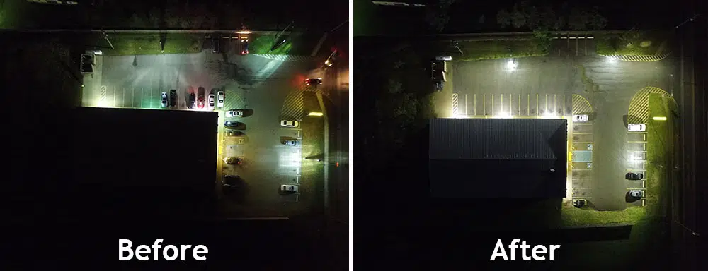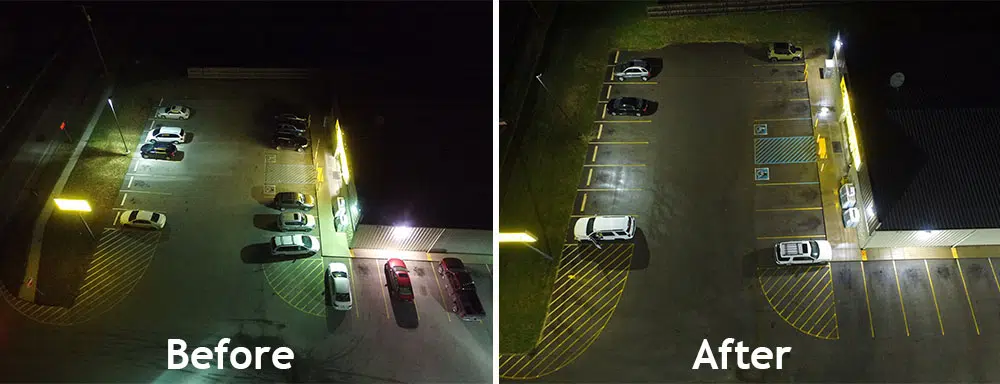 Here are a few comparison images from one of our LED parking lot lighting retrofits. Check out the video review of this case study: A Before and After Comparison of an LED Parking Lot Retrofit
